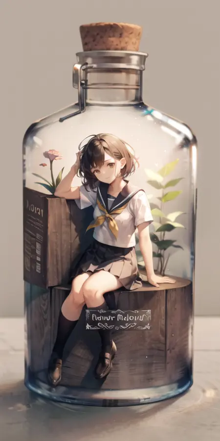 Saved: 00184-2265992698-1girl, solo,bottle, simple background, arms behind back,looking at viewer, kimono, full body,minigirl,gib_(concept_),submerged,.png