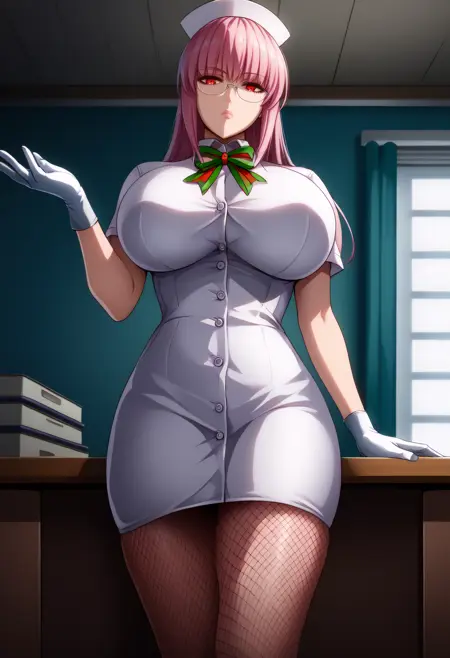 flnighting_finalsanta, red eyes, pink hair, hair down, nurse cap, fishnet pantyhose, white dress, short sleeves, bowtie, white gloves, buttons, collared dress, glasses,