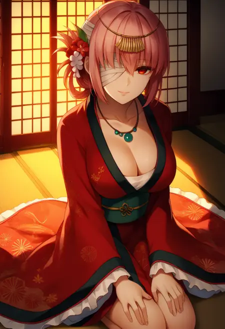 flnighting_divinedress, red eyes, pink hair, folded ponytail, hair flower, hair ornament, necklace, headpiece, bandage over one eye, bandaged head, jewelry, hanfu, chinese clothes, wide sleeves, long sleeves, red dress, floral print, sash, frilled sleeves, cleavage, collarbone,