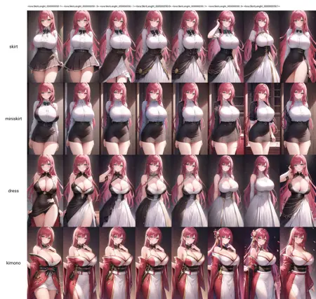 miniskirt: kind of iffy at least in anythingV4.5, seems the lenght is extremely tied up to the concept so it likely would need it own LECO(might give it a try later.)