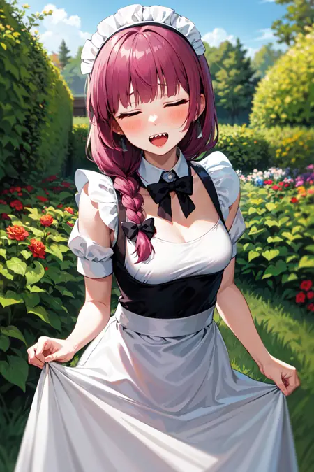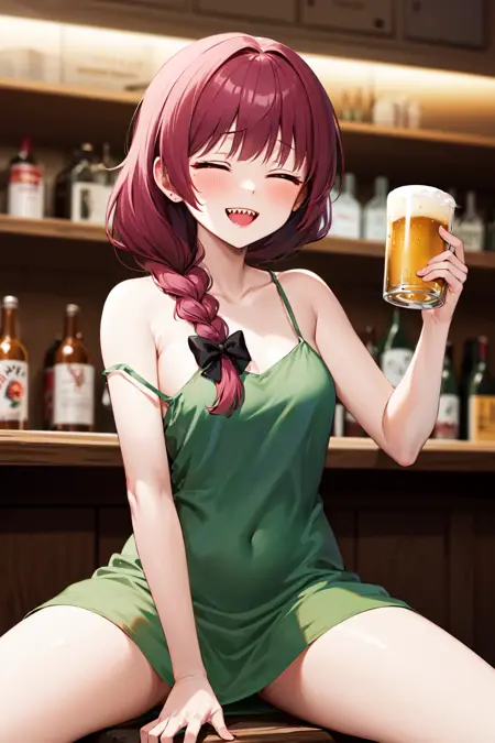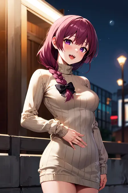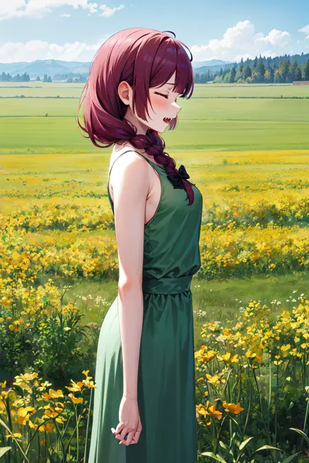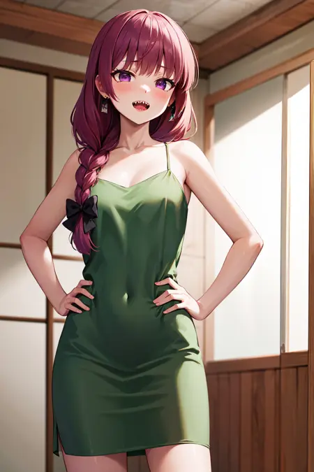 outfit1-1aakikuri, long hair, single braid, hair bow, hair over shoulder, purple eyes, sharp teeth, medium breasts, green dress, sleeveless
