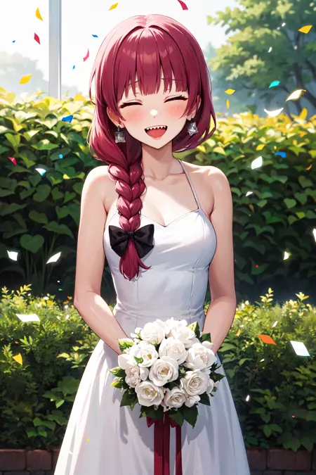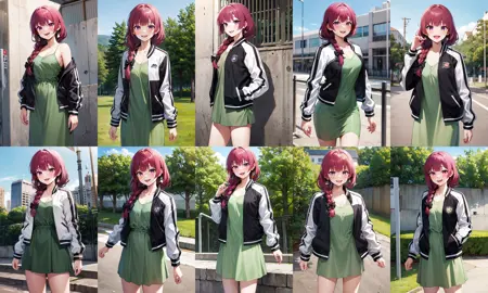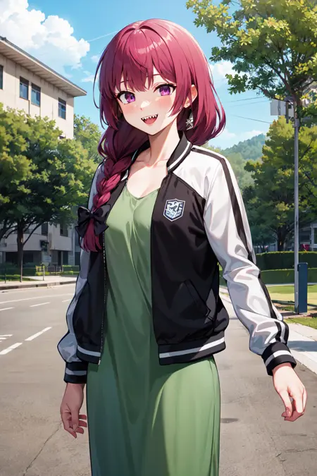 outfit1aakikuri, long hair, single braid, hair bow, hair over shoulder, purple eyes, sharp teeth, medium breasts, green dress, letterman jacket, two-tone jacket, open jacket, long sleeves(purple eyes ↔ closed eyes), (+ off shoulder)