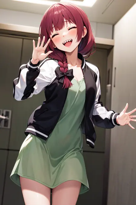 衣装1aakikuri, long hair, single braid, hair bow, hair over shoulder, purple eyes, sharp teeth, medium breasts, green dress, letterman jacket, two-tone jacket, open jacket, long sleeves(purple eyes ↔ closed eyes), (+ off shoulder)
