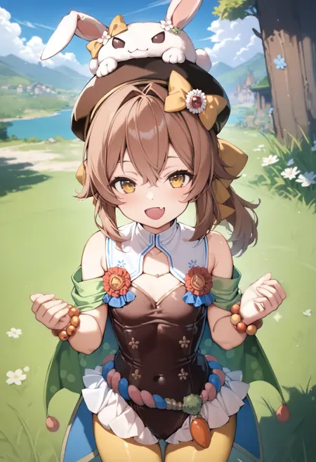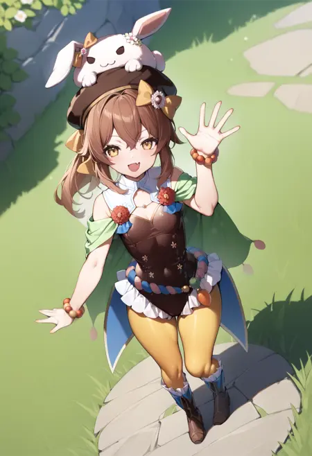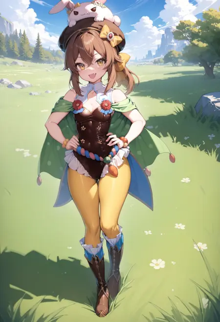 Add "hat,hair bow,cape,leotard,bead bracelet,waist rope,pantyhose,rabbit on head,boots" for her spring look.(Spring_PonyXL,Spring_AnimagineXL)