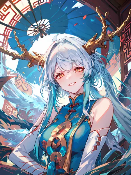 Basic characteristic : Silver hair, ( short hair ) ,gradient hair,braids,yellow eyes,horns, ( wings ) , ( tail ) , ( scales ) ;