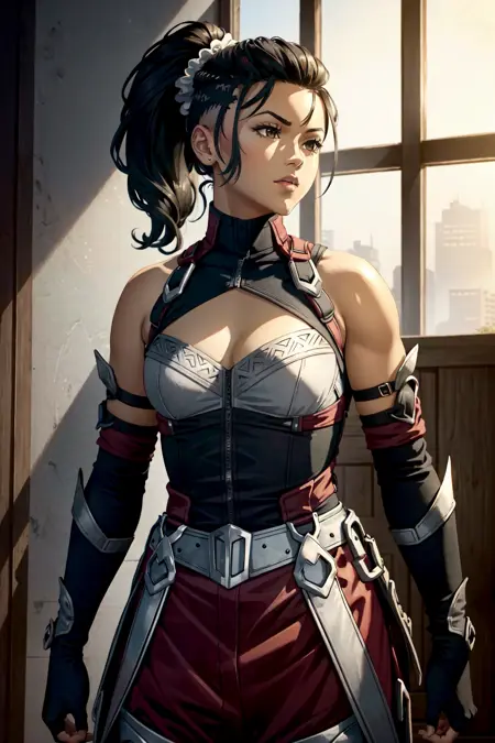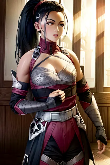 Mileena, human form, human, 1girl, breasts, solo, gloves, black hair, long hair, cleavage, fingerless gloves, bare shoulders, elbow gloves, medium breasts, ponytail, front hump ponytail, shaved sides with ponytail, medium breasts, leggings