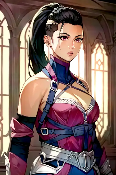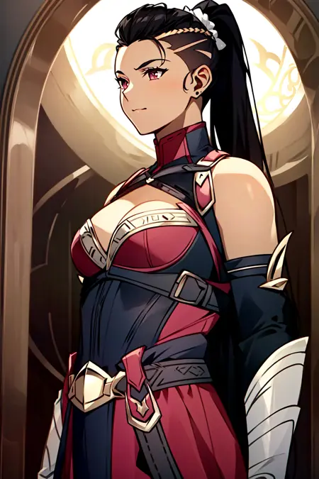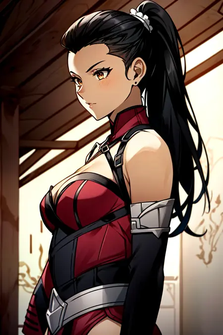 Mileena、人間形態、人間、1girl、胸、シングル、手袋、黒髪、ロングヘア、胸元の開き、指なし手袋、肩出し、肘まで手袋、中程度の胸、ポニーテール、前髪のポニーテール、両サイドを剃ってポニーテール、中程度の胸、レギンス