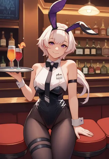 Reno Bunnino: renobunny, long hair, rabbit ears, playboy bunny, leotard, white shirt, black necktie, single elbow glove, wrist cuffs, black pantyhose, thigh strap