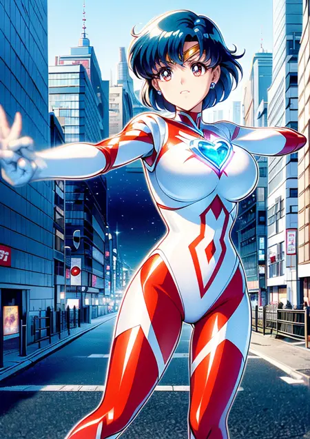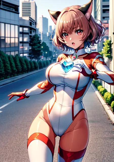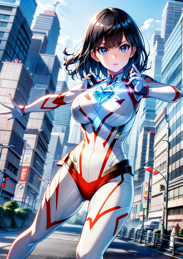 When I tested LoRa by combinating of other LoRa characters, it produced an image of an ultra-heroine with a red and white bodysuit and a heart-shaped jewel on her chest.