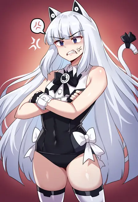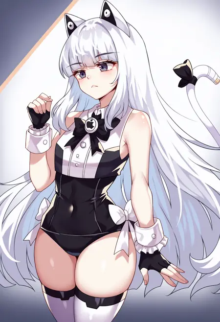 bare shoulders, cat tail, black gloves, fingerless gloves, wrist cuffs, tail ornament, black leotard, white shirt, sleeveless, thighhighs, bowtie, tail bow