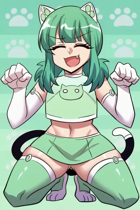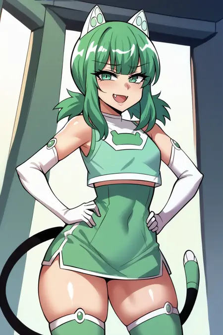 Add "white and green dress, elbow gloves, white gloves, green thighhighs, tail" for her typical look.