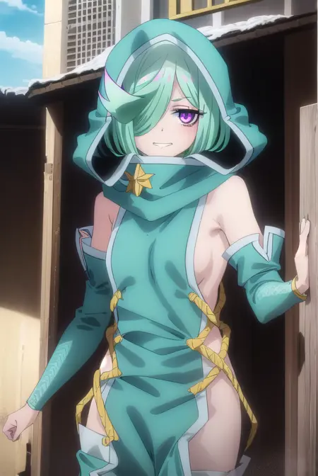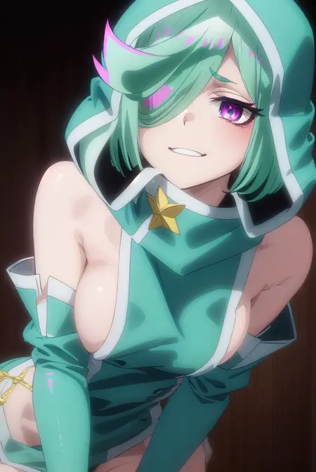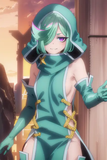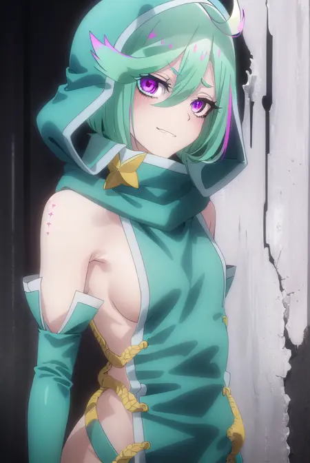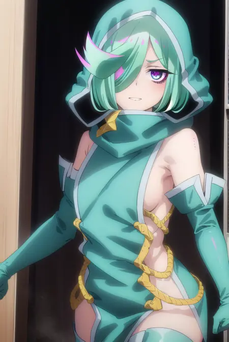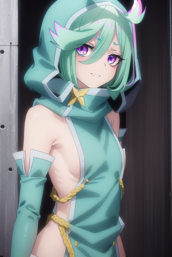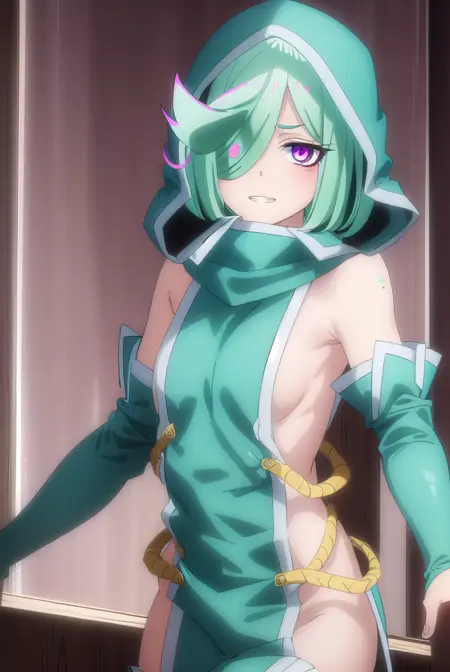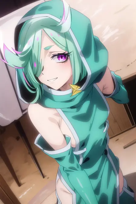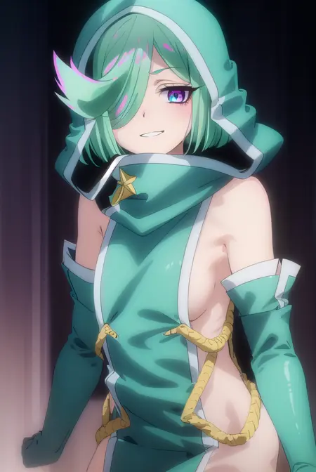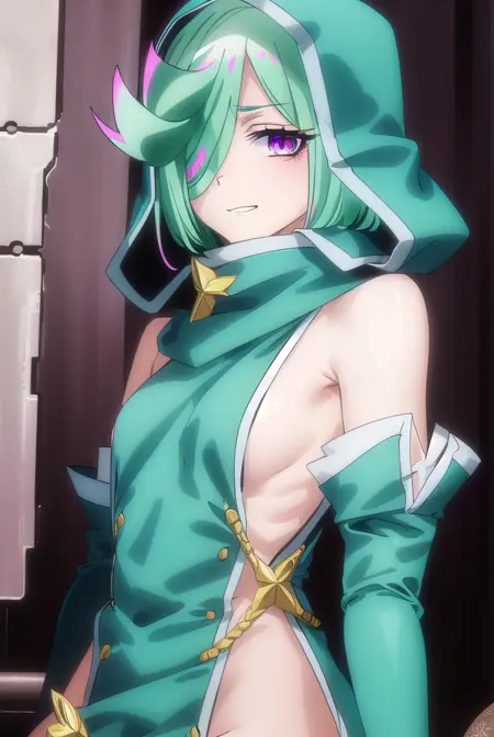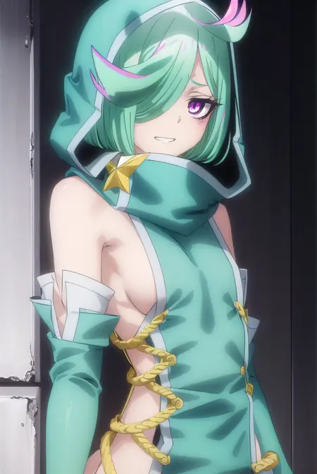 nemo anemo, short hair, green hair, (pink eyes:1.3), (hair over one eye:1.5), aqua hair, ahoge,