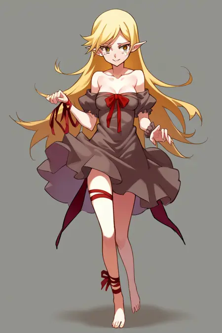 Shinobu Oshina, yellow eyes, blonde hair, extremely long hair, pointy ears, blonde hair, barefoot, dress, leg ribbon, bare shoulders, collarbone, wrist ribbon
