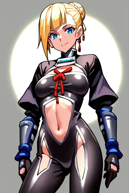 Ninja 109, blonde hair, blue eyes, navel, hair bun, red ribbon, single hair bun, black gloves, breastless clothes, bangs, short hair