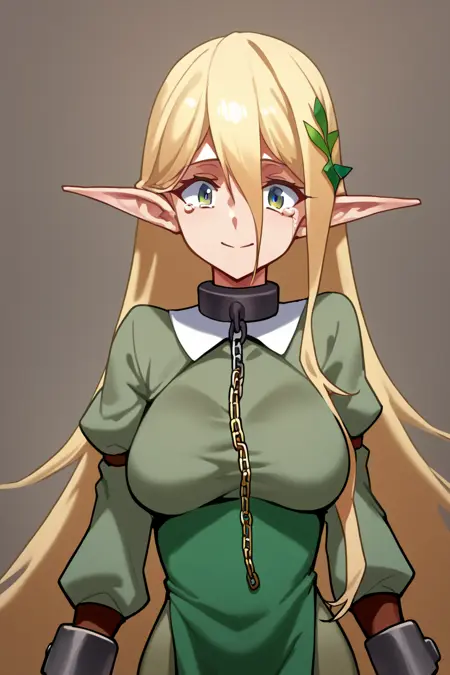 Elf 109, blonde hair, hair between eyes, very long hair, elf, elf ears, hair ornament, {slave, shackles, chains, }
