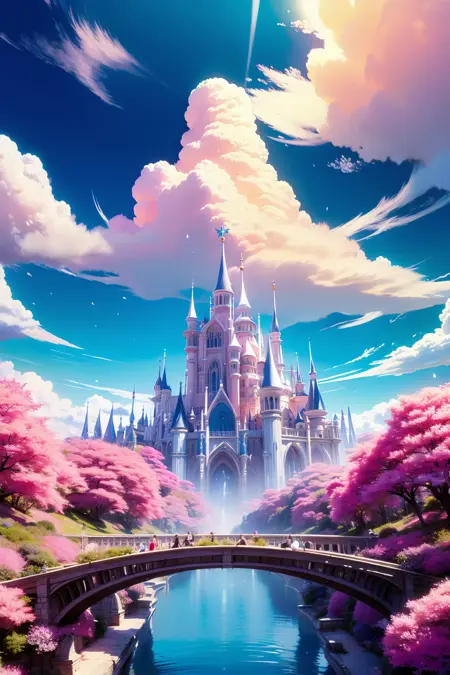 2: mhxy, 구름, 풍경, 하늘, 야외, 인물 없음, 나무, 푸른 하늘, 낮, 새, 다리, 흐린 하늘, 판타지, 벚꽃, 도시 경관, 건물, 성, 도시.