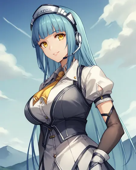 <lora:TrailsThroughDaybreak-Playable:0.9>, Risette Twinings, yellow eyes, blue hair, long hair, blunt bangs, large breasts, concierge, metal headpiece, headset, yellow neckerchief, elbow gloves, white gloves, waist apron, garter straps, black thighhighs, white boots, high heels,
