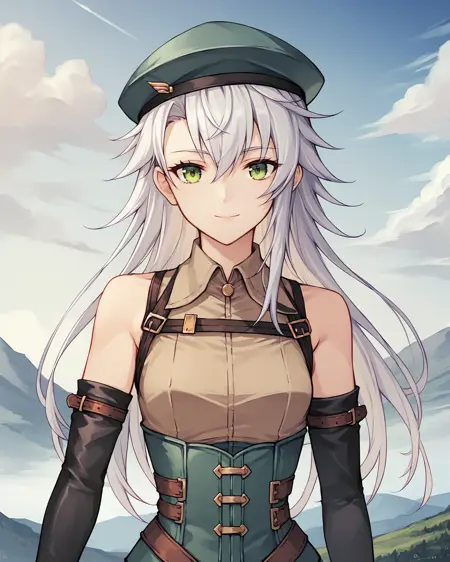 <lora:TrailsThroughDaybreak-Playable:0.9>, Fie Claussell, white hair, long hair, green eyes, medium breasts, green beret, green corset, white skirt, brown top, bare shoulders, black gloves, elbow gloves, black boots, thighhigh boots,
