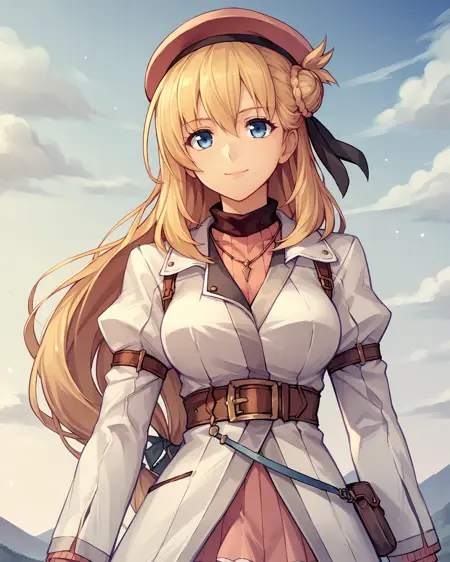 <lora:TrailsThroughDaybreak-Playable:0.9>, Agnes Claudel, blonde hair, long hair, blue eyes, large breasts, hair ornament, beret, white coat, turtleneck dress, necklace, belt, pink skirt, pantyhose, brown boots, thigh boots,