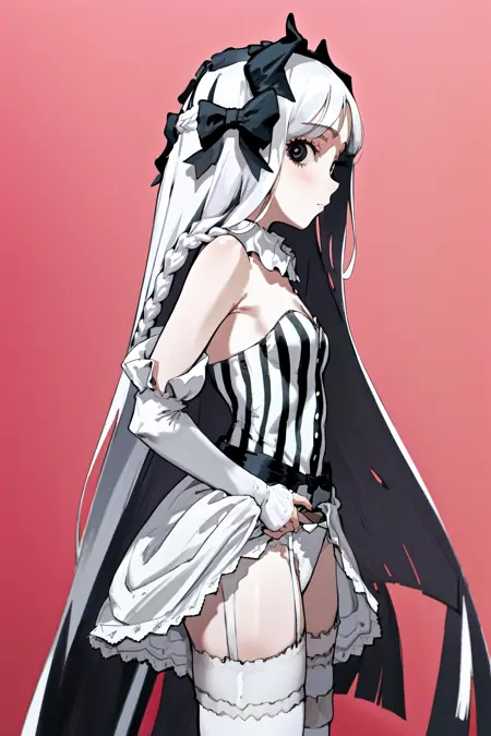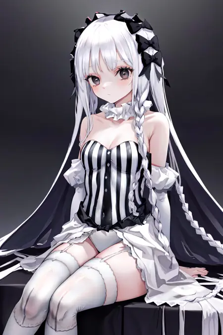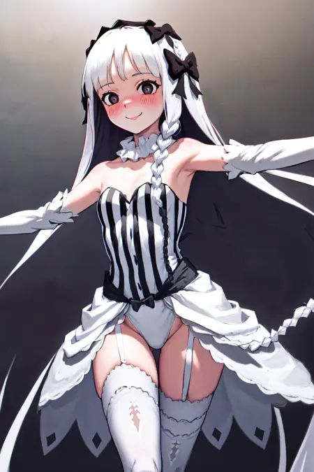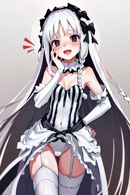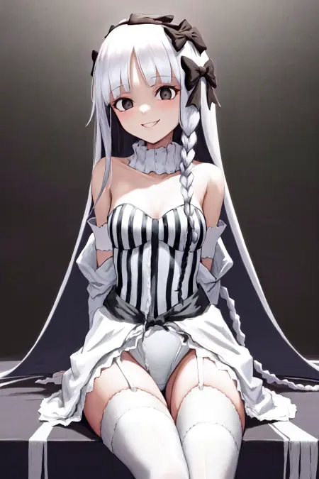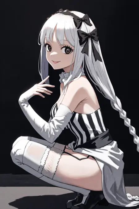 デフォルトの衣装: 白いカラーのストライプ模様のドレスレotard、白いタイツ、取り外し可能な袖、ガーターストラップ