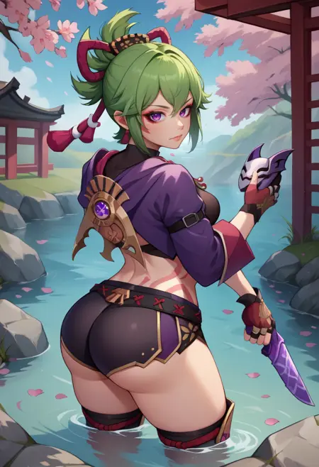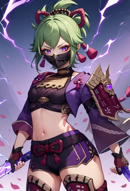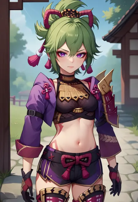 Character prompt: Kukishinobu, 1girl, solo, breasts, looking at viewer, bangs, hair ornament, thighhighs, gloves, long sleeves, navel, hair between eyes, purple eyes, jacket, ponytail, sidelocks, cowboy shot, green hair, open clothes, shorts, black gloves, midriff, stomach, armor, open jacket, crop top, short shorts, mask, black shorts, fishnets, rope, cropped jacket, mouth mask, purple jacket, shimenawa, body markings, ninja mask