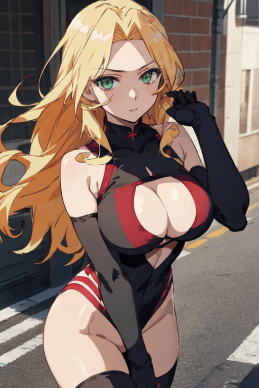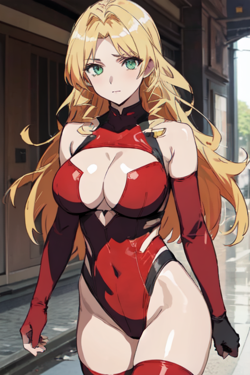 MeiMomozono, 1girl, solo, long hair, blonde hair, large breasts, thighhighs, elbow gloves, cleavage, green eyes, red leotard, clothing cutout, cleavage cutout,