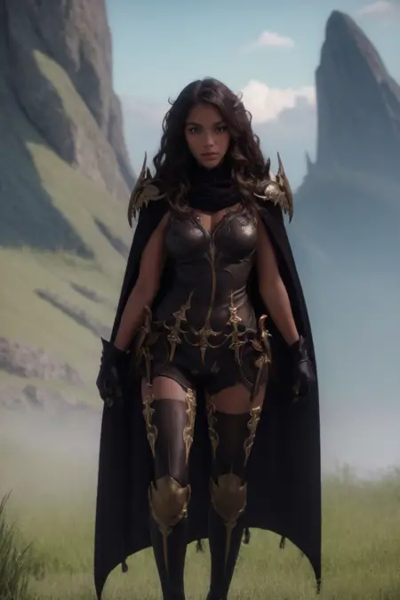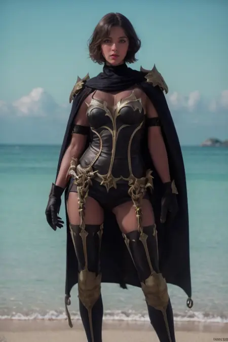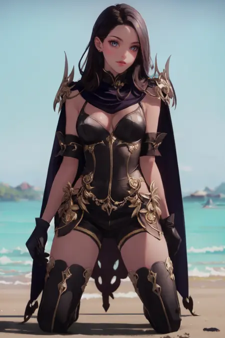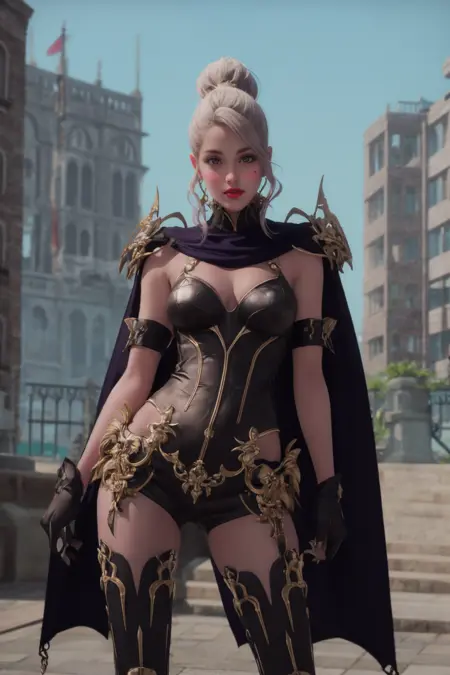 元の衣装に近い仕上がりを希望する場合は、プロンプトに「パウドロン、ケープ、ボディスーツ、シンハイズ、シンブーツ、ブラックグローブ」を含めることを推奨します。