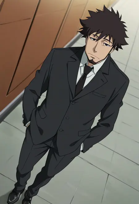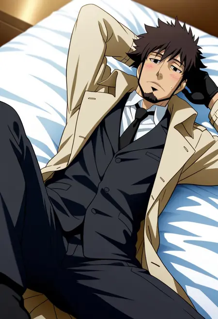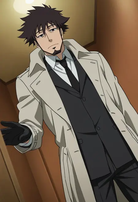 Prompt: Genma Shizume, black hair, (medium hair, slight spiky hair, spread hair:1.4), black eyes, (sideburns, facial hair, chinstrap beard, jawline beard:1.2), black suit, white shirt, black necktie, (black jacket:1.3), (beige trench coat, open trench coat, long coat:1.3), black pants, black shoes