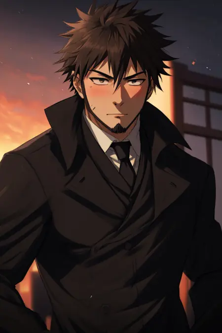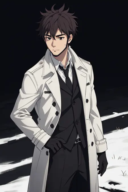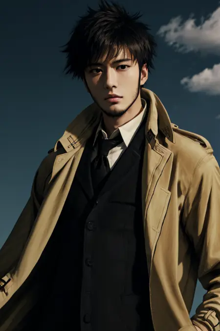 프롬프트: 진무 시즈메, 검은 머리카락, (중간 길이 머리, 약간 스파이키한 머리, 퍼진 머리:1.4), 검은 눈, (윗수염, 안면 털, 턱수염, 턱선 수염:1.2), 검은 정장, 흰 셔츠, 검은 넥타이, (검은 재킷:1.3), (베이지 토렌트 코트, 벌어진 토렌트 코트, 긴 코트:1.3), 검은 바지, 검은 신발