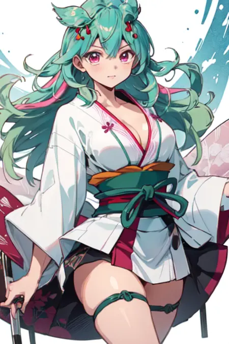 TsugumiHattori, 1girl, solo, long hair, hair ornament, red eyes, cleavage, medium breasts, japanese clothes, green hair, pink eyes, short kimono, sash, obi, sandals,