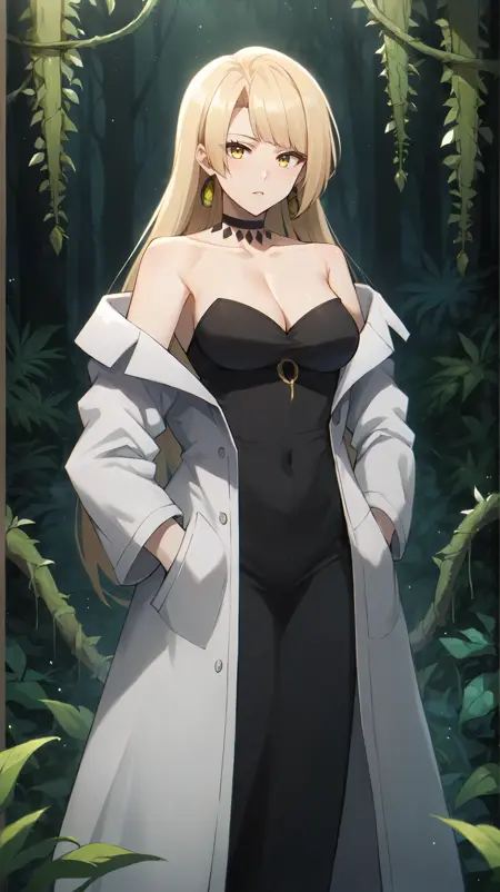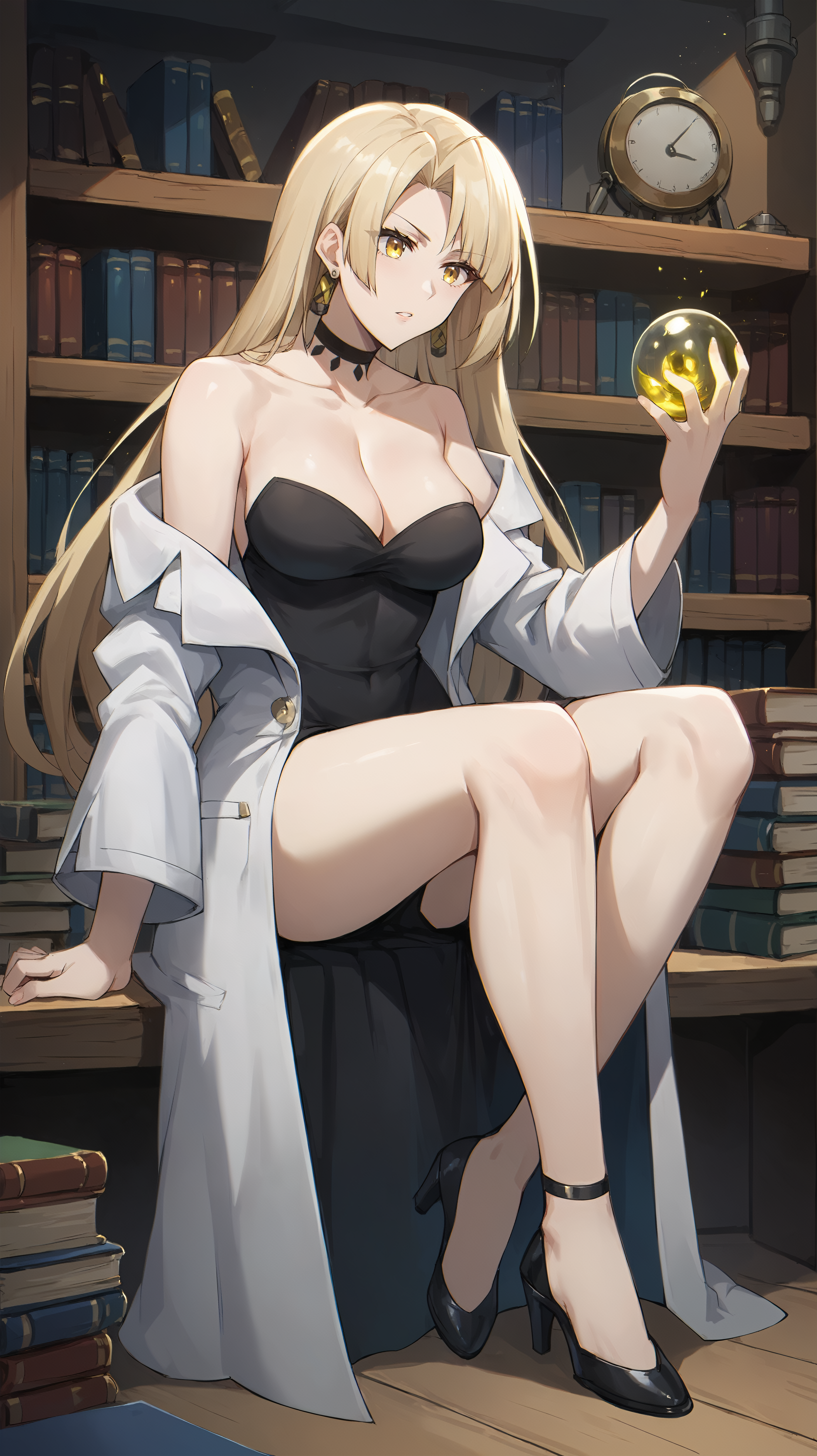 long hair, blonde hair, yellow eyes, choker, earrings, black strapless dress, labcoat, bare shoulders