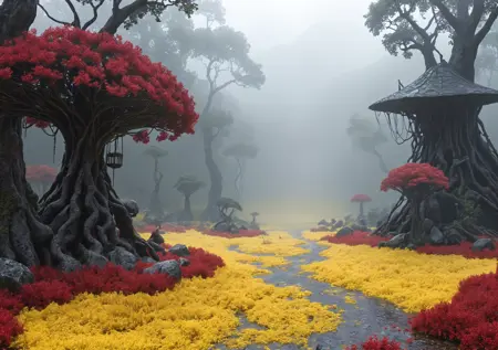 Trees and bushes in background, fog and mist looks flat. Mountains and buildings will look like constructed with basalt columns.