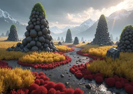 This LoHa model was trained on a mix of 3D Concept arts, real life basalt column coast images and many SDXL generated conceptual low-poly scenes with Voronoi-shaped prisms protruding from ground (low-light mostly).