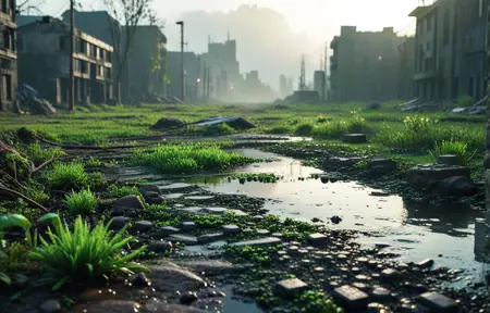 Trees and bushes in background, fog and mist looks flat. Mountains and buildings will look like constructed with basalt columns.