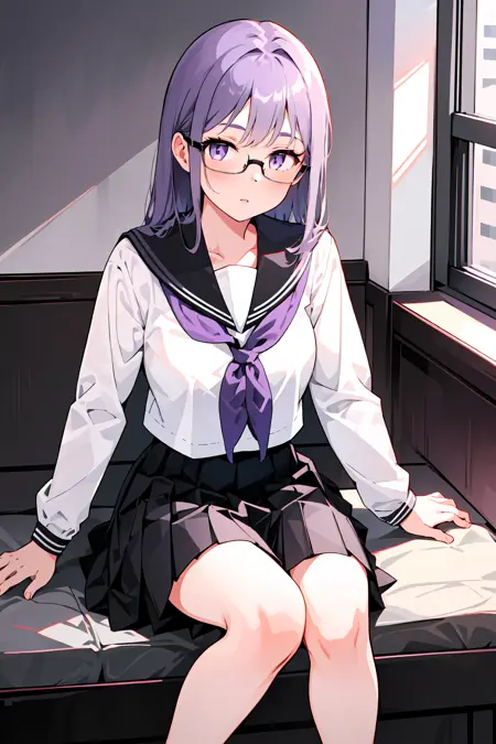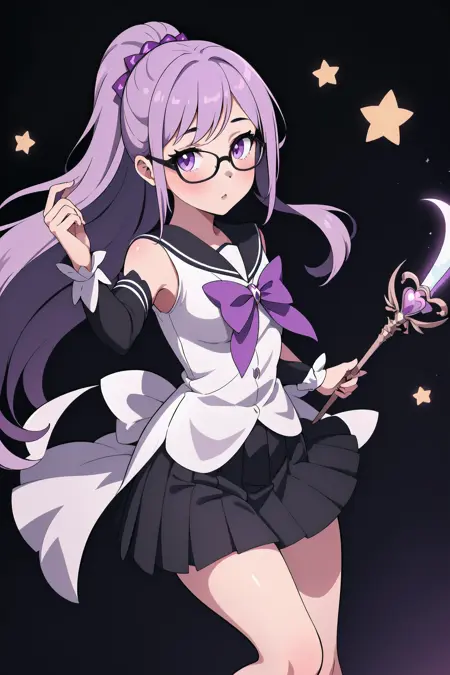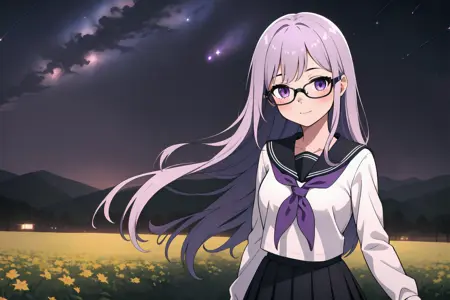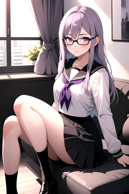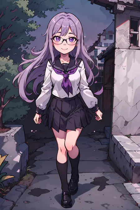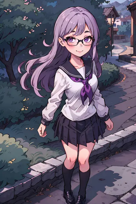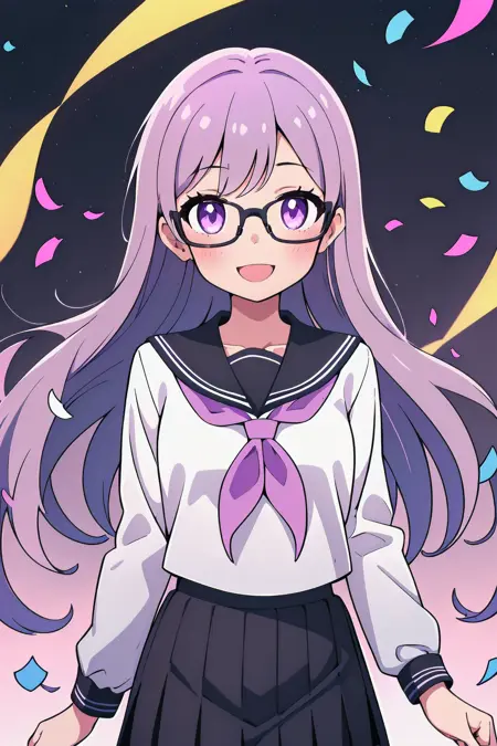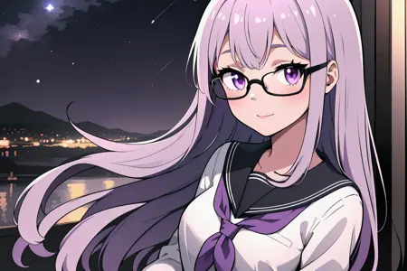 However, seeing as the character's physical characteristics are quite simple (long light purple hair, purple eyes, black-framed glasses), if you want a really different outfit, then it might be better to simply generate the image without using a LoRA at all.
