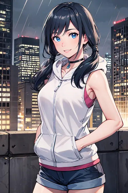Outfit : sleeveless hoodie, sleeveless shirt, denim shorts