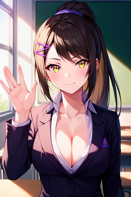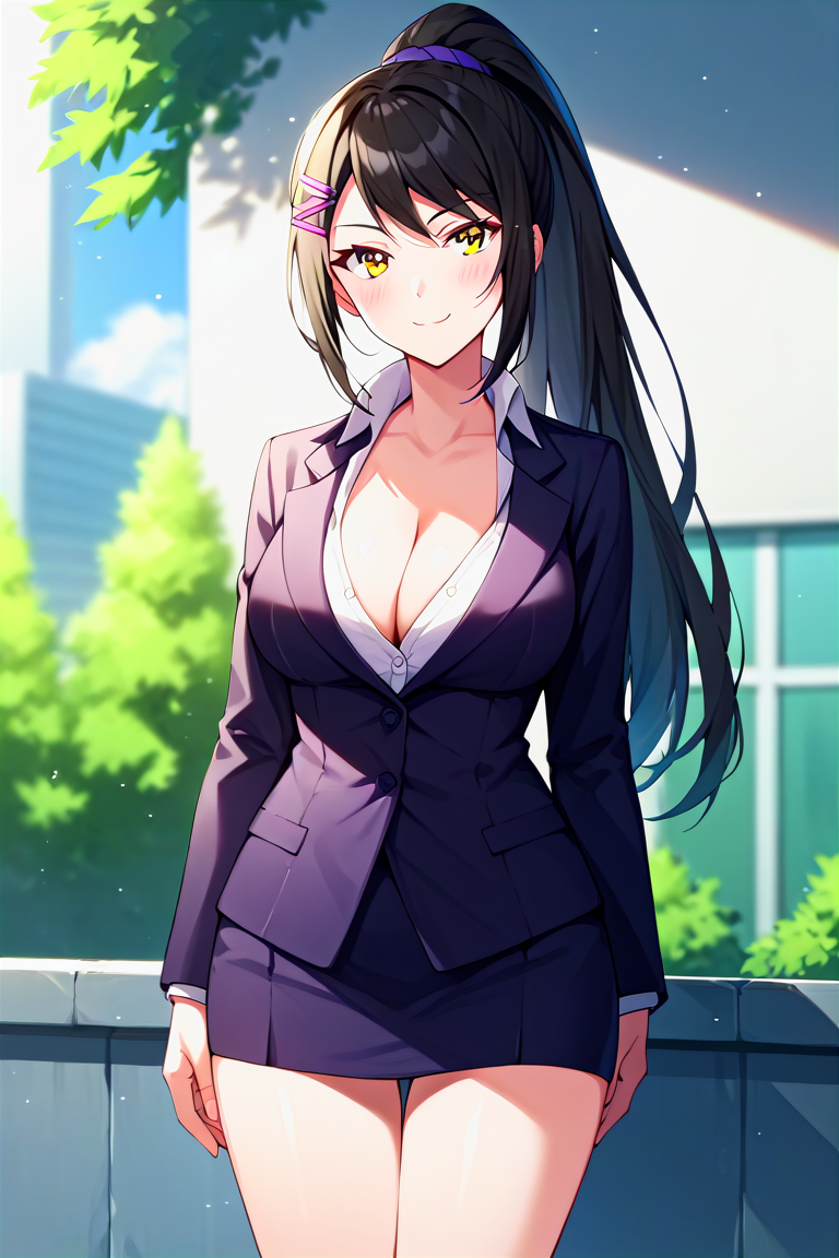 Trigger Words: ``sae chabashira, long hair, yellow eyes, ponytail, hair_clip,``