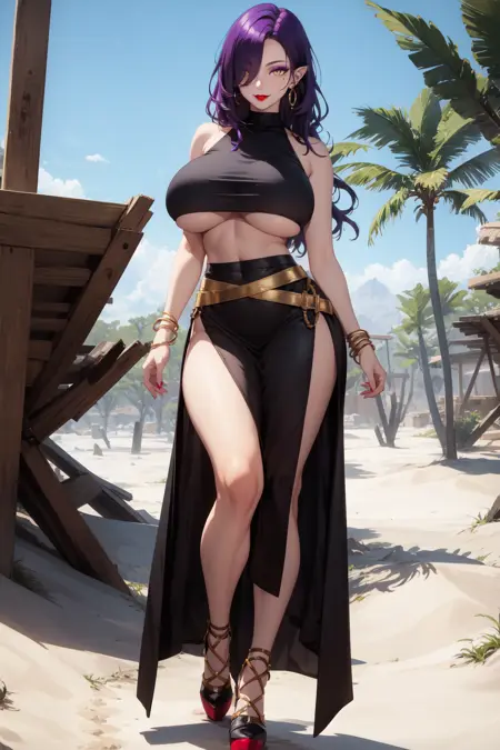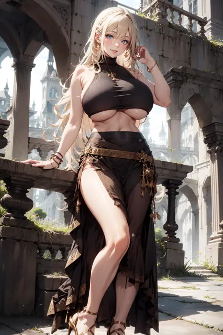 Prompt: bare shoulders, bracelet, brown crop top, earrings, high heeled sandals, long hair, long skirt, midriff, navel, shawl, side slit, sleeveless croptop, underboob