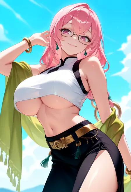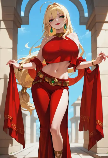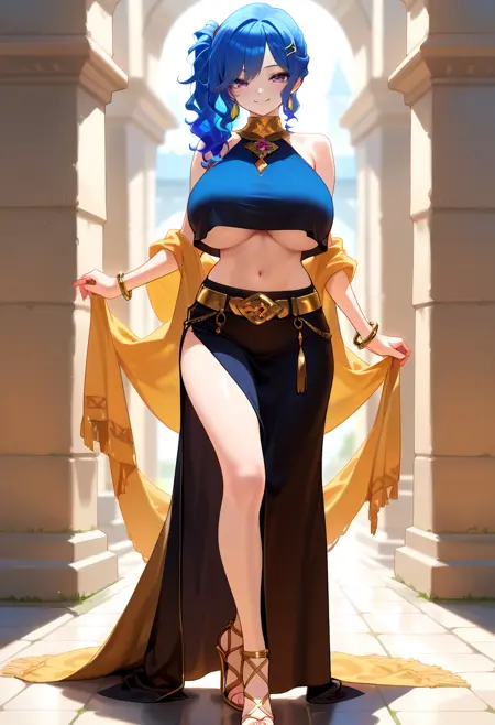 Outfit Positive Prompt: crop top, underboob, bare shoulders:1, jewelry, bracelets, shawl:1, gold trim, gold shoes, sleeveless:1, halter, long skirt,