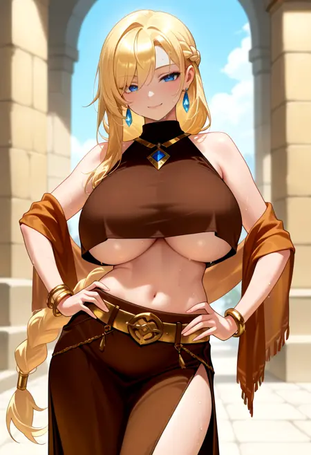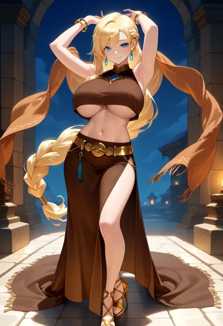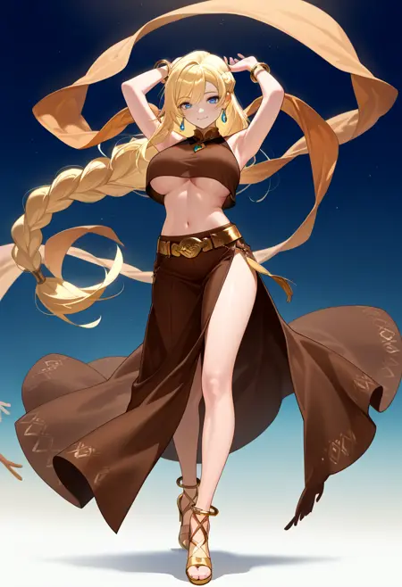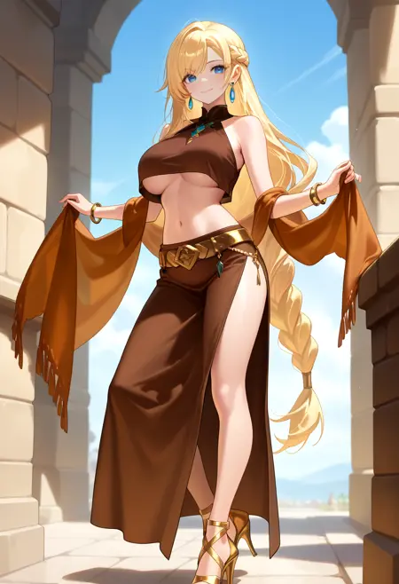 Prompt: bare shoulders, bracelet, brown crop top, earrings, high heeled sandals, long hair, long skirt, midriff, navel, shawl, side slit, sleeveless croptop, underboob