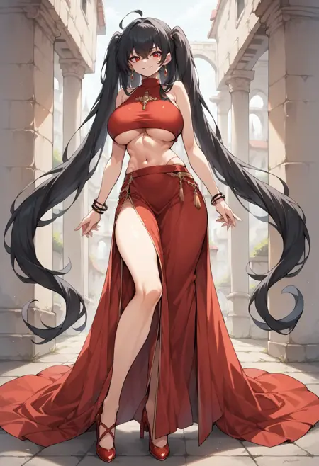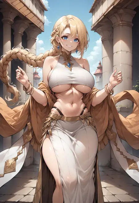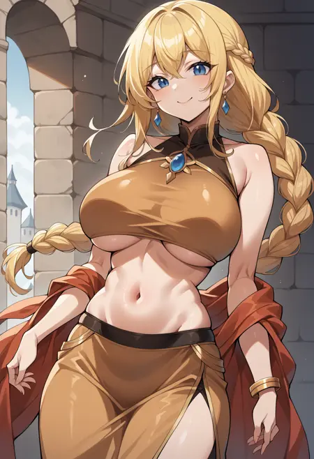 Outfit Positive Prompt: crop top, underboob, bare shoulders:1, jewelry, bracelets, shawl:1, gold trim, gold shoes, sleeveless:1, halter, long skirt,