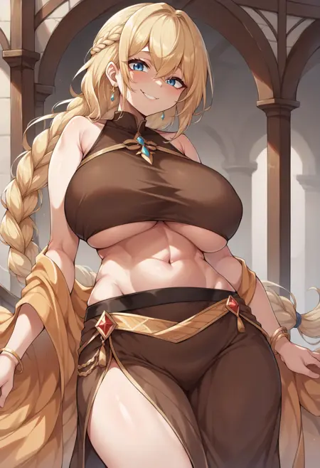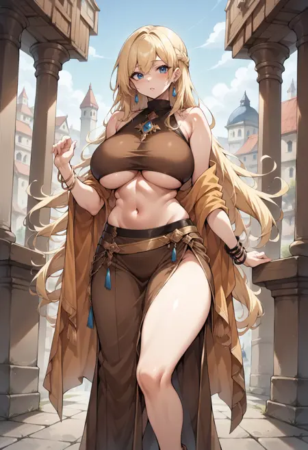 Prompt: bare shoulders, bracelet, brown crop top, earrings, high heeled sandals, long hair, long skirt, midriff, navel, shawl, side slit, sleeveless croptop, underboob