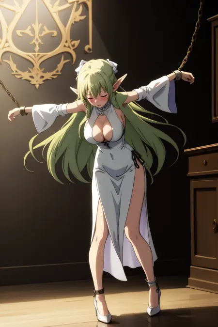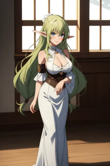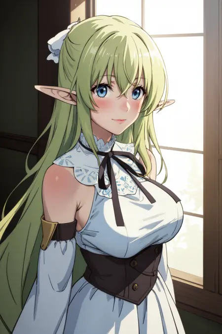 Riruru, very long hair, green hair, pointy ears, elf, blue eyes
