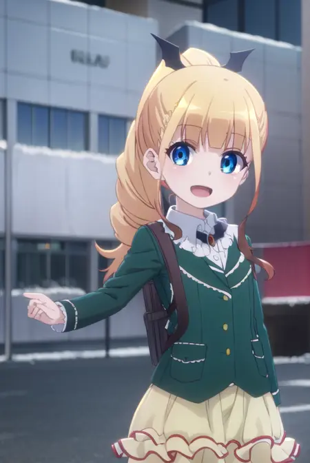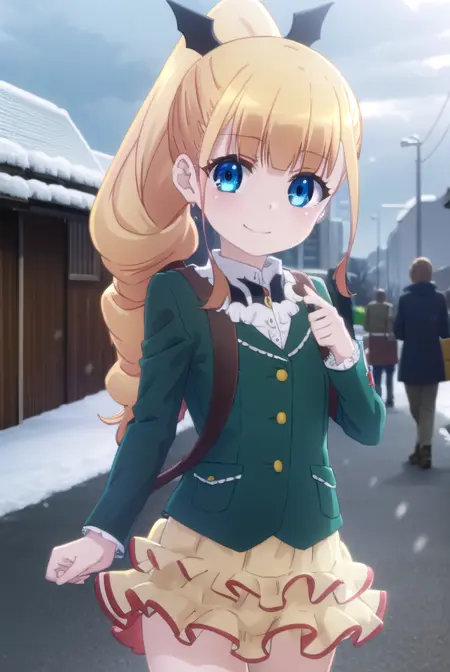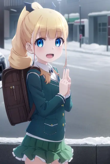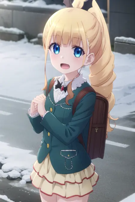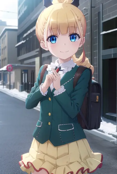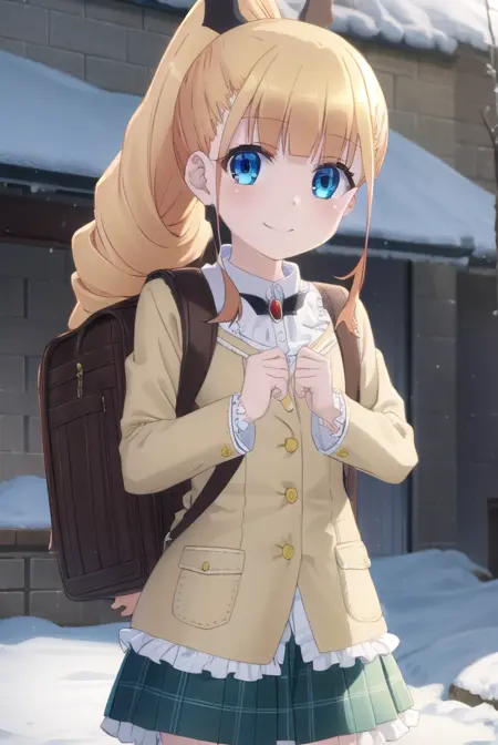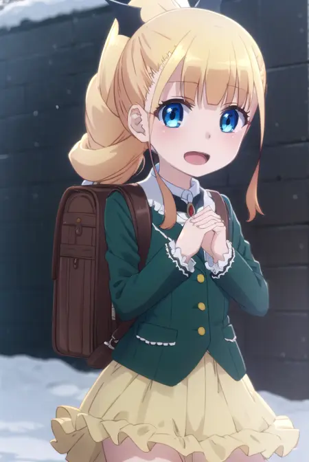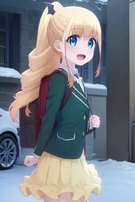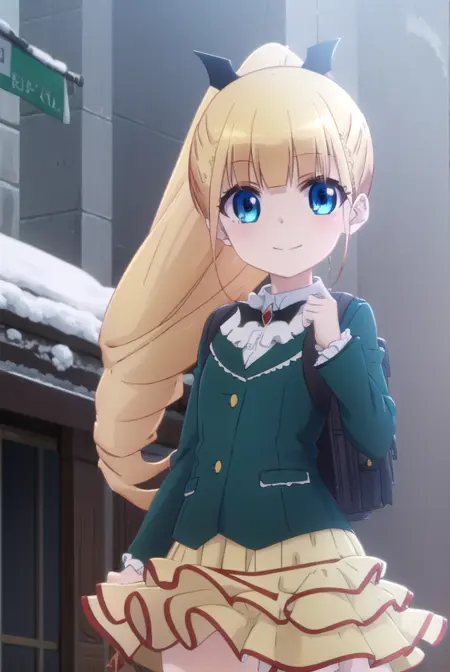 erika ainsworth, long hair, bangs, blue eyes, blonde hair, hair ornament, ponytail, blunt bangs,