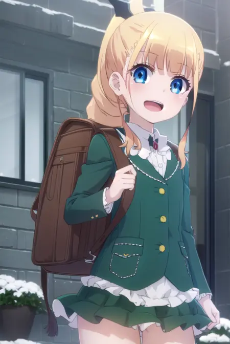 shirt, bag, backpack, green jacket, frills, randoseru, skirt, frilled skirt,