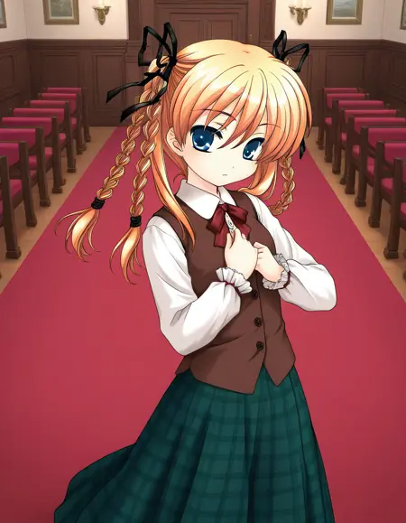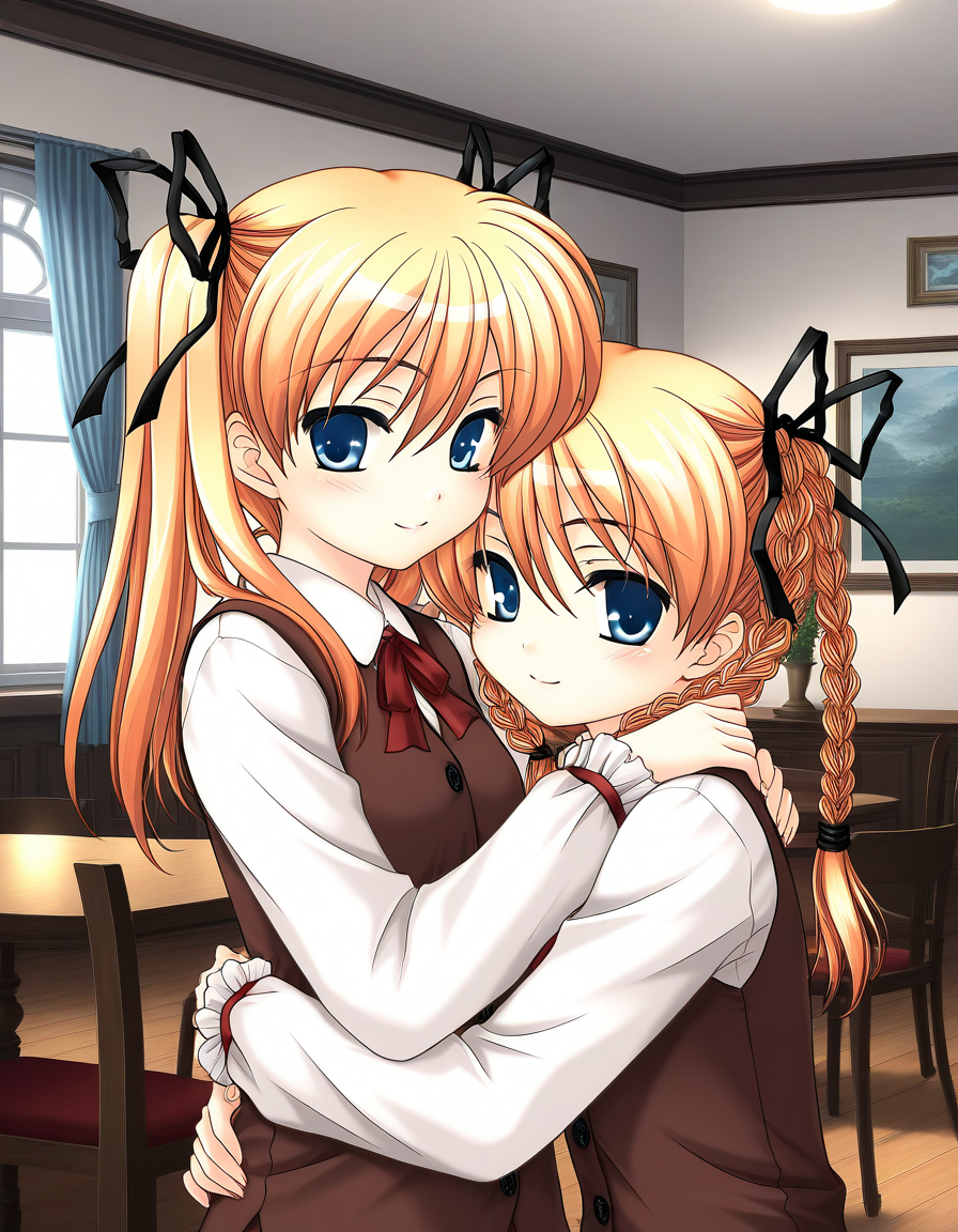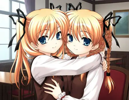 Itsuki&Imi, blonde hair, blue eyes, ribbon, long hair, hair ribbon, braid, twin braids, short stack,