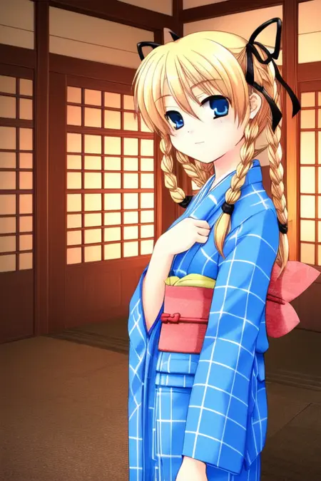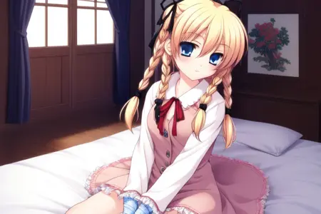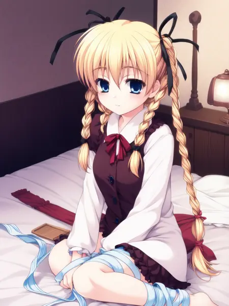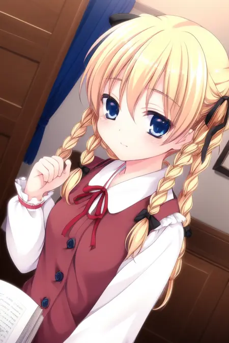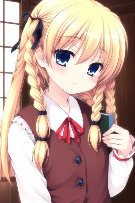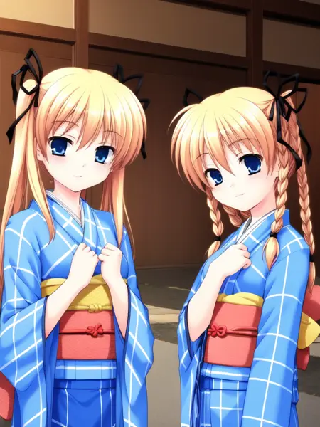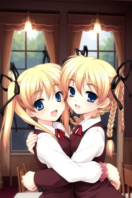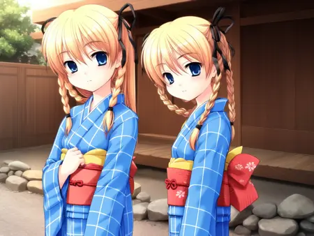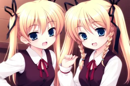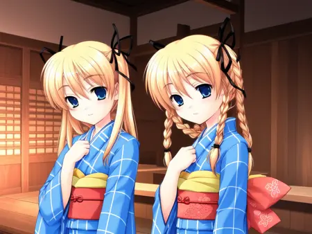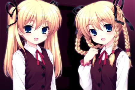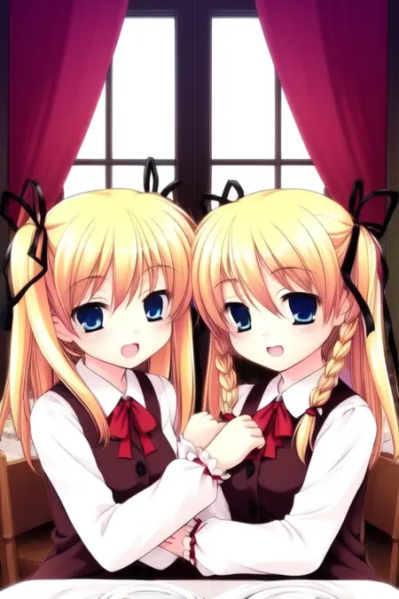 Itsuki&Imi, blonde hair, blue eyes, ribbon, long hair, hair ribbon, braid, twin braids, short stack,