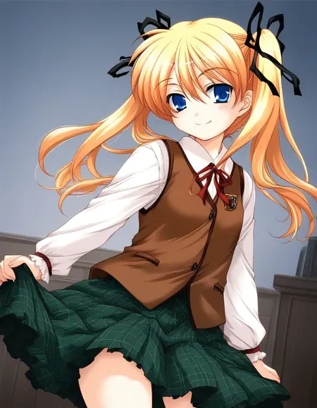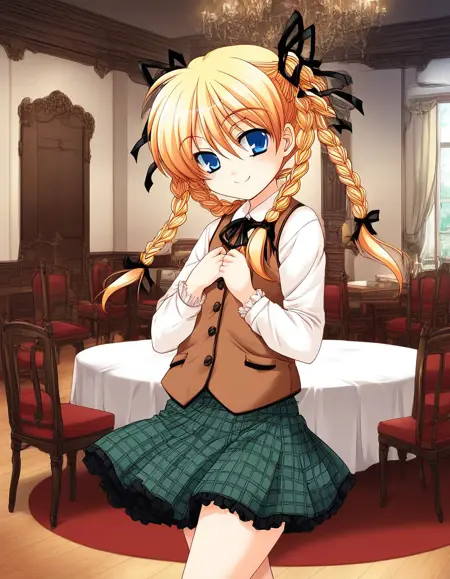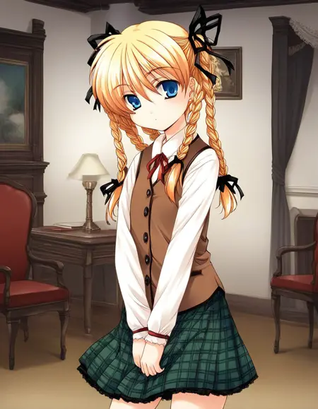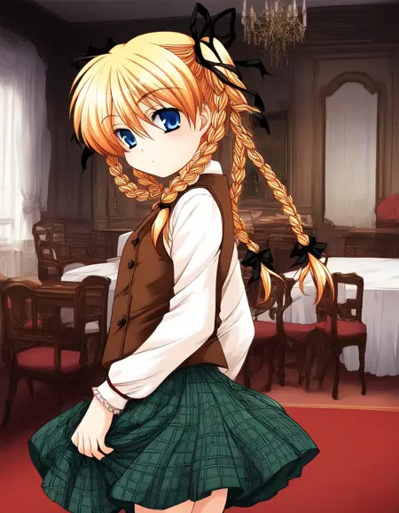 brown vest, checked skirt, green skirt,