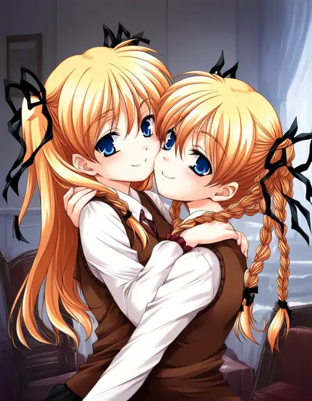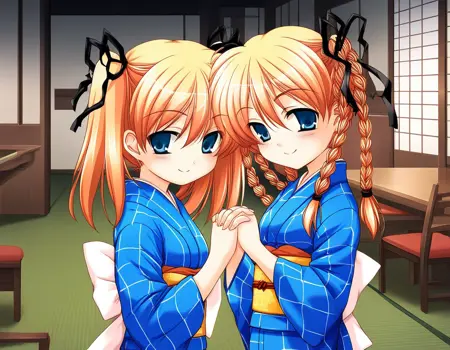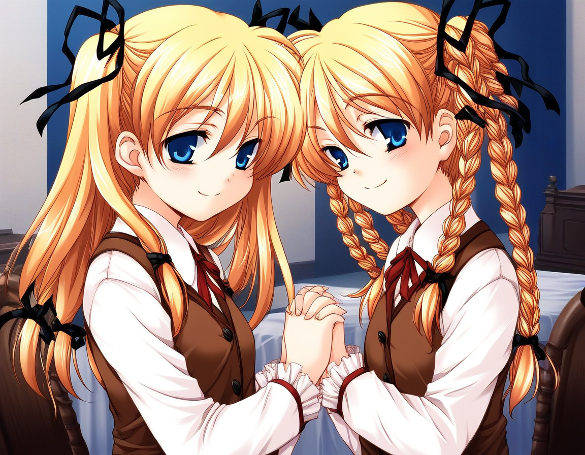 Itsuki&Imi, blonde hair, blue eyes, ribbon, long hair, hair ribbon, braid, twin braids, short stack,