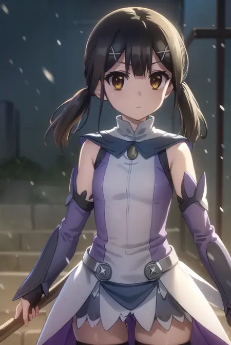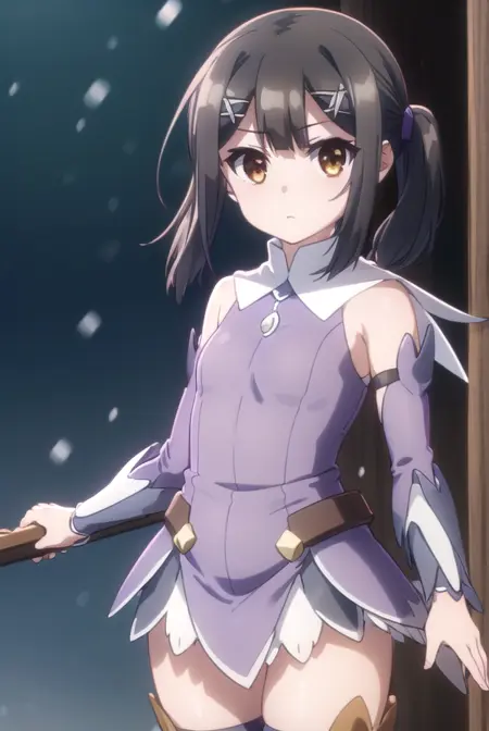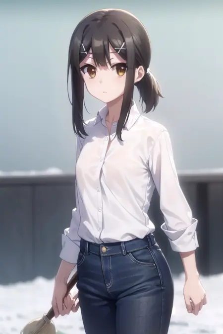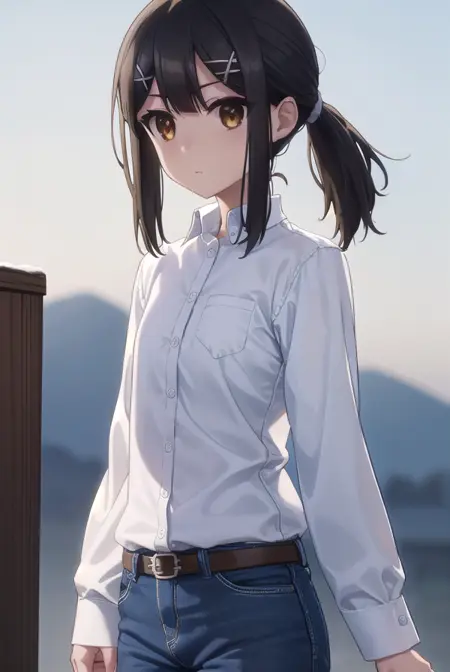miyu edelfelt, (black hair:1.5), hair ornament, hairclip, x hair ornament, (brown eyes:1.5),